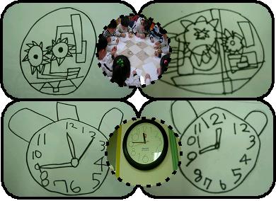 시계의 앞모습을 표상하며 시간에 관심을 갖기 시작하고 그에 대해 갈등을 빚고 있는 아이들.