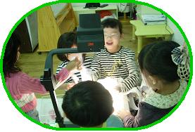 함께 있던 아이들은 자기가 만든 만들기를 OHP 위에다 올려본다.