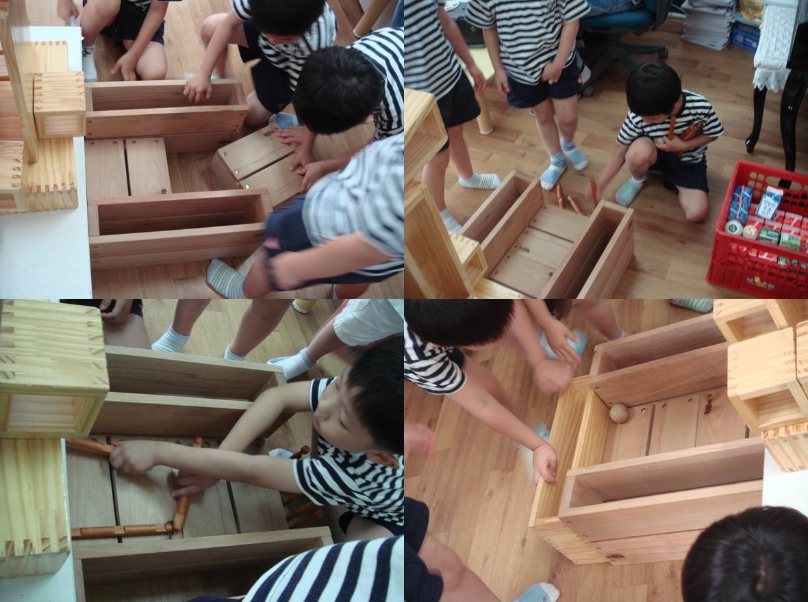 유아들은 공을 굴렸고, 공은 첫번째 장애물을 지나서 벽에 부딪히고 아래로 떨어져 지그재그 길을 통과하여 도착지점에 요철길을 통통통 튀며 무사히 도착하였습니다.