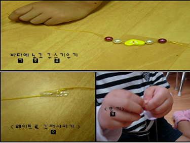 그런데 테이프로 늘어나는 줄을 묶었던 목걸이가 많은 구슬을 달수록 시간이 지날수록 풀어져 구슬이 모두 빠져버립니다. 유아: 묶으면 구슬 안 빠진다.