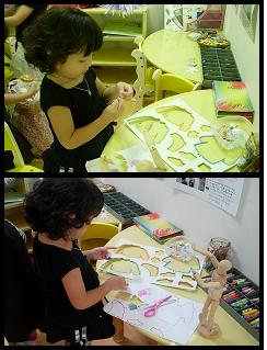 한쪽에서는 옷 본을 이용해 그리고, 오려서 옷을 디자인하고 있어요.