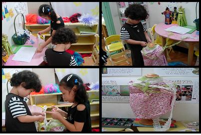 천과 레이스를 고른 유아들은 마네킹에 천을 두르고 테이프로 고정합니다.