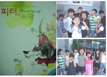 회색늑대를 생포하는 용감한 소년 피터는 현악4중주/ 피터의 친구인 작은새는 플루트 /이 작은 새와 말다툼을 하여 늑대에게 잡아먹히는 집오리는 오브에/ 살금살금 들어와서 새를 노리는 고양이는 클라리넷 / 언제나 심통을 부리는 피터의 할아버지는 파곳 / 숲속에 사는 회색빛 늑대는 3개의 호른 / 용감한 사냥꾼들의 총소리는 팀파니- 공연장 출입이 제한된 유아들을 위한 공연장 체험교육!! 유아들이 이해하기 쉬운 피터와 늑대라는 동화에 곡을 붙여 오케스트라의 연주회를 체험 할 수 있는 좋은 기회였다. 다양한 악기의 아름다운 선율을 듣는 것은 물론이였고 공연장체험을 하면서 공연장에서 지켜야 될 약속에 대해서도 직접 알아볼 수 있었다.