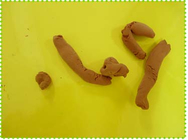 아이클레이(점토)를 이용하여 팔찌와 반지를 만들고 몇 일이 지나자 말랑말랑하고 제멋대로 변하던 것이 말라버렸습니다. 신나는 마음에 손가락에반지를 끼우자 유아: 선생님, 작아서 부서졌어요.