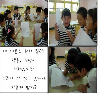 유아1: 이것 봐~ 우리가 행동연습했던 사진이 있어. 유아2: 여기에 우리가 말했던 행동이 적혀있어. 유아3: 감정도 적혀있지? 유아들: 강당으로 가서 연습해봐요.