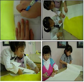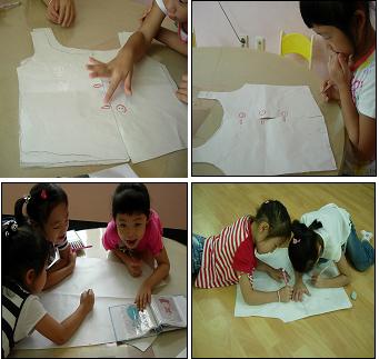 의상팀은 자를 사용하여 원래 원피스 보다 조금 더 큰 원피스를 그려 나갑니다. 옷 만들기 과정을 반복하면서 터득한 아이들의 능숙한 실력!! 그리기와 자르기 동시에 뚝딱 뚝딱!교사: 우리들이 만든 옷을 한번 볼까? 어떤 느낌이 들어? 유아1: 재미없어요. 유아2: 심심해.