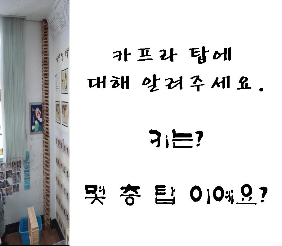 다른 유치원 선생님들께서 방학 중에 우리 반에 찾아와서 카프라 탑을 보며 궁금해하시던 두 가지 질문을 유아들에게 알려 주었습니다.
