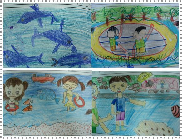 - 바다에 갔는데 물이 너무 차가워서 발만 담갔어요. 그리고 가족들이랑 조개도 잡았어요.* 그림일기