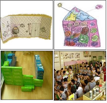 유아3: 벽난로, 식탁, 사람 3명이 들어갈 수 있어야해요. 유아4: 맞아. 그런데 헨젤과 그레텔이 바닥에서 자야하잖아. 그럼 집이 커야해.
