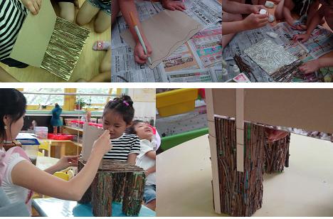 - 싸인펜으로 물결무늬를 종이에 그리자 모두들 만족한다. 그러자 모양에 맞게 자르고 다시 목공풀을 이용해 나뭇가지를 붙이기 시작한다. 앞에 붙여 본 경험 덕분인지 이제 제법 붙이는 손놀림이 빠르다.* 어떻게 연결하지?