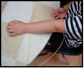 준비된 나무젓가락을 살펴보았다. 나무젓가락은 너무 짧아서 화살 만들기 재료로 안 될 것 같다는 의견이 나왔고 화살의 크기에 대해 다시 생각해 보았다. 자신의 팔에 활을 대어보고는 팔꿈치에서 손끝까지의 길이가 적당하다고 하였다. 길이가 긴 나무를 구할 수 있는 방법을 생각하였고 부모님의 도움을 얻어 해결하기로 했다.