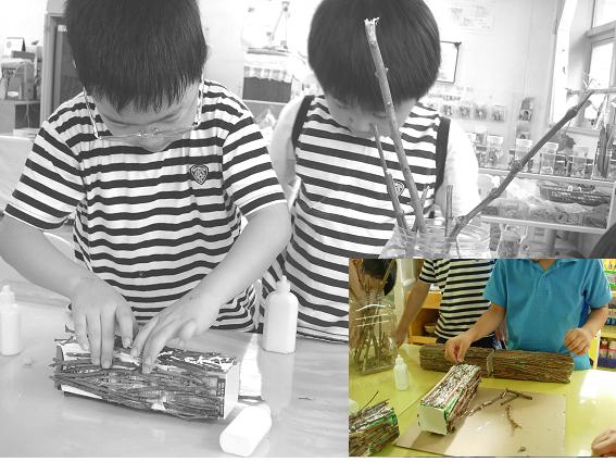유아1: 아니. 나뭇가지로만 연결하는 건 힘들어! 우유팩을 펼치거나 아님 딱딱한 종이에 나뭇가지를 붙이는게 좋겠어.