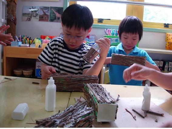 - 교사가 나뭇가지를 작게 부러뜨려주자 아이들은 빈틈에 쏙 들어간다며 붙인다.