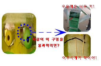 유아: 그럼 이건 어때? 이쑤시게. 이걸로 사람을 만들면 구멍을 통과 할 수 있을거 같은데.
