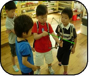 다음날 다시 모였다. 유치원 복도에 있는 활을 발견하였고 교실로 가지고 왔다.