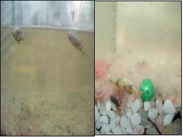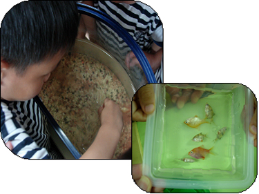 -열대어는 수돗물을 바로 넣으면 죽기 때문에 다음날 물을 갈아주기위해 통에다가 물을 받아 놓았습니다. 그런데 다음날 아침 너무나 속상한 일이 생겼습니다. 4마리의 물고기는 물 위에 둥둥떠있고, 2마리의 물고기는 바닥에 붙어 있는 것입니다등원을 하던 유아들은 물고기가 있는 곳으로 모였고, 몇 명의 유아들은 속상한 마음을 표정으로서 표현합니다. 유아: 물고기 죽었어요.