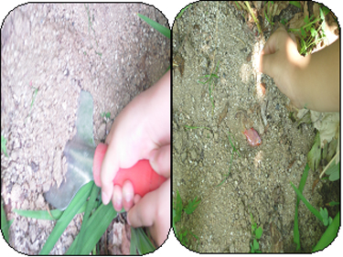 -유아들과 함께 죽은 물고기를 묻어주기로 합니다. 놀이터에는 친구들이 놀다가 밟으니까 안돼고, 잔디에는 땅을 깊이 팔 수 없어서 안된다고 합니다. 그래서 앵두나무 옆 식물을 심어 놓은 곳 중 흙이 있는 곳을 골라 물고기를 묻어줍니다.