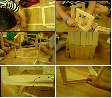 유아1: 우리는 바닥을 만들고 기둥 4개를 세우고 위에 나무를 놓는데, 사진에는 나무로 벽 4개를 만들어서 세워요.