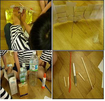 유아1: 오늘은 바닥을 넓은 걸로 받침대를 만들어 봐야겠어. 유아2: 나는 철사로 해볼께.
