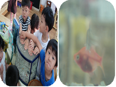 -물고기에 밥을 주면서 유아들의 관찰하는 시선이 바뀝니다. 물고기가 밥 먹는 모습을 보고 입 모양을 흉내내면서 물고기와 더욱더 가까워져 갑니다.