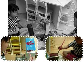 유아1: 이 의자는 진짜 나무로만 만들었네. 우린 딱딱한 종이에 붙였는데..