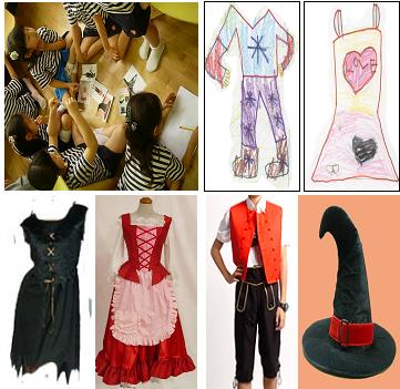 유아들의 대화를 듣고 교사는 여러 무대의상 사진을 제공합니다.