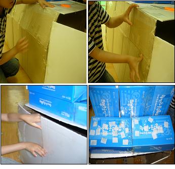 유아5: 테이프로 상자 붙이는 것보다 찍찍이랑 보슬이로 붙여보면 쉬울 것 같아!