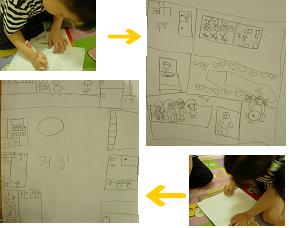 집의 내부를 무엇으로 채울까 생각하던 아이들에게 우리 집의 설계도를 그려 보는 것이 어떻겠냐고 권했다. 아이들은 각자 집의 모습을 생각하며 설계도에 방을 구분하고 각 가전제품과 가구들을 그림으로 표현하였다.