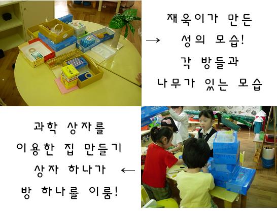 - 한 유아가 다양한 상자를 이용하여 성 만들기를 계획하고 작품을 만들었다. 그 후 친구들의 다양한 생각과 솜씨를 도움 받아 방에 침대나 욕조 등으로 더 멋지게 꾸며 주었다. 그리고 성에 관한 책을 보고 조화 잎을 이용하여 나무를 만들어 친구들의 부러움을 샀다.