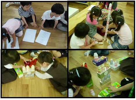 여러가지 패턴을 이용하여 탑을 쌓기, 요구르트만을 이용해 길게 붙여 탑쌓기... 등 여러가지 방법으로 탑을 쌓던 친구들에게 문제점이 생기기 시작했다.