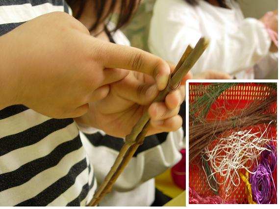 - 지난 시간에 나뭇가지를 연결할 때 목공풀과 테이프만 이용하던 아이들이 한 유아의 제안으로 철사로 연결하는 방법을 알게 되었다.