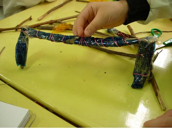 - 나뭇가지와 철사, 셀로판지를 이용해 의자의 앉는 부분과 다리 2개를 연결한다.