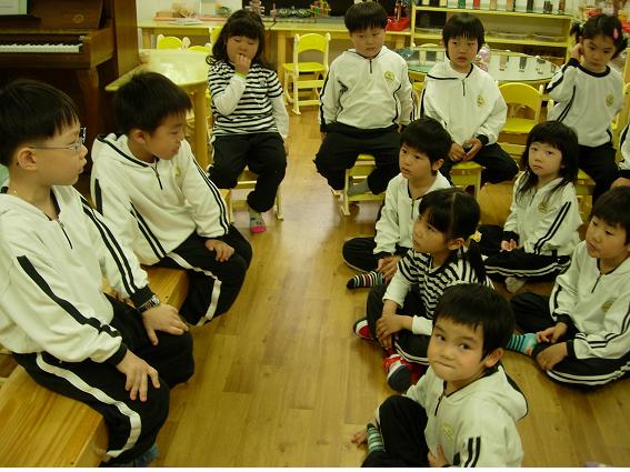 유아3: 그런데 다리 길이가 달라서 넘어지겠는데* 만든 의자를 세워보니 넘어진다. 한 유아가 몇 번을 이리저리 만져 조절해 보지만 여전히 넘어간다. 그래서 전체 유아들이 모여 해결방법을 찾기 위해 공유를 하였다.