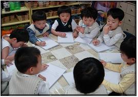 재활용품으로 칼, 총, 방패 등을 만들어 교실을 이리저리 돌아다니는 아이들이 함께 모였다.