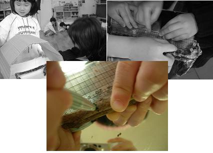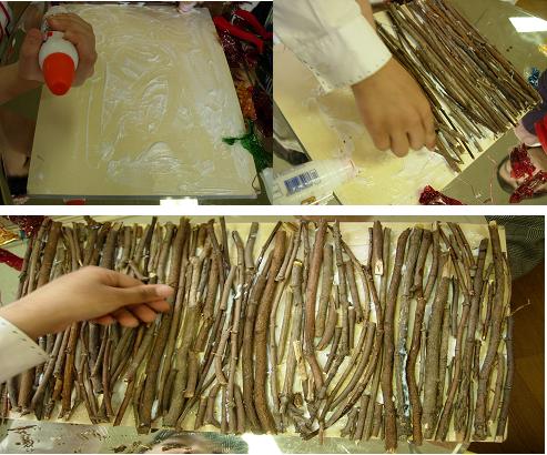- 딱딱한 종이를 찾는 유아들에게 교사가 하드보드지를 지원하자 목공풀을 바른 후 잘라 논 나뭇가지를 붙이기 시작합니다.