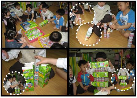 각 재료별로 탑을 만들어보기로 했던 아이들은 한가지의 재료가 아닌 여러재료를 섞어서 탑을 만들어 보기로 다시 합의했다. 그 후 아이들은 우유팩과 요구르트병을 이용해 여러가지 모양의 탑을 만들어 보았다.