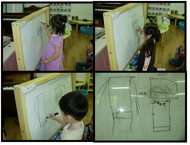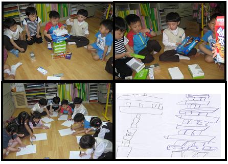 아이들은 자꾸만 넘어지는 원인이 상자의 무게 때문이라 이야기하며 무거워야 상자는 넘어지지지 않는다고 주장했다. 여러가지 의문점과 해결책을 내며 탑을 쌓아본 아이들은 자신만의 탑을 만들어보고 싶어했다. 그래서 우리는 다시 표상활동을 통해 자신만의 탑을 계획하고 다음시간 탑을 또다시 만들어 보기로 약속했다.