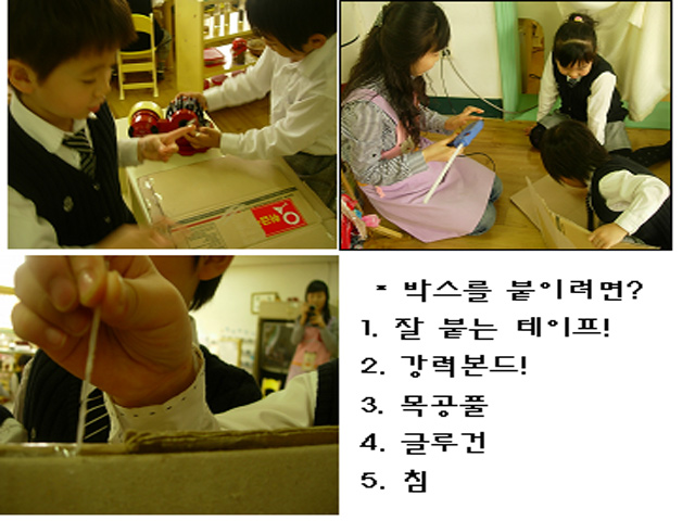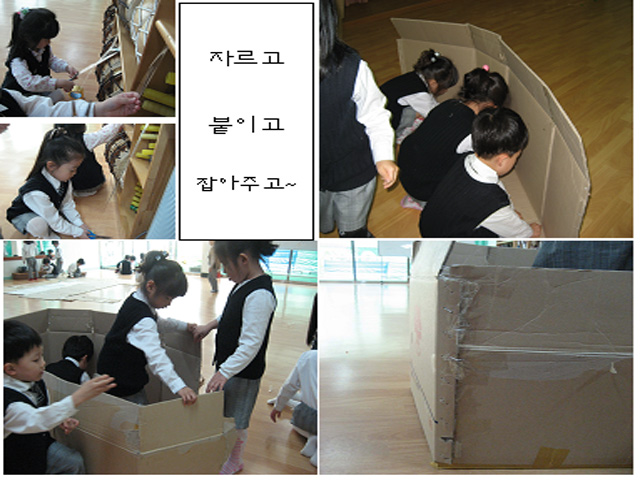 유아6: 여기 박스가 이어진 부분은 붙이지 않으면 움직이잖아. 그걸 문으로 꾸미면 어때?