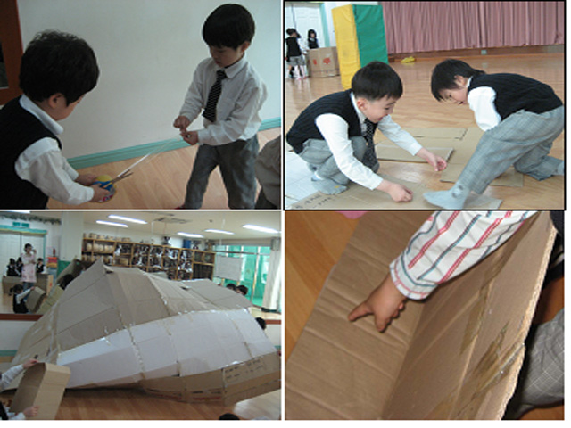 유아1: 우리도 상자를 펼쳐서 만들어야 할 것 같아요. 과자집이랑 같은 방법으로 하면 좋겠어.