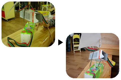 돛이 세워지는 순간 유아의 기쁨도 잠시...또 다시 돛이 넘어져 버렸다. 리본 끈의 연결로 비록 돛이 세워졌지만 구멍이 커 다른 방향으로 돛이 넘어진 것이다.