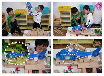 다음날 아침 아이들은 헬리콥터에 관심을 보이며 쌓기 영역에서 헬리콥터로 놀이를 시작했다.