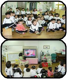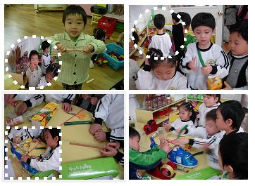 재활용으로 놀이를 해보았던 아이들에게 친구들이 재활용품으로 어떤 놀이를 했는지 보여주며 이야기 나누었다. 유아들은 자신들의 놀이에 많은 관심을 보였고, 어떤 놀이를 했는지 직접 친구들에게 가르쳐 주는 모습까지 볼 수 있었다.
