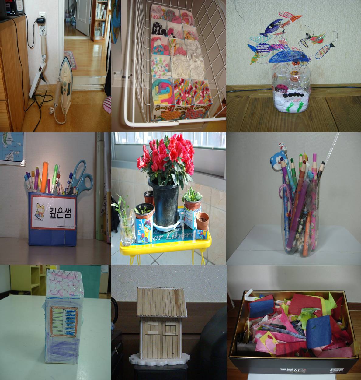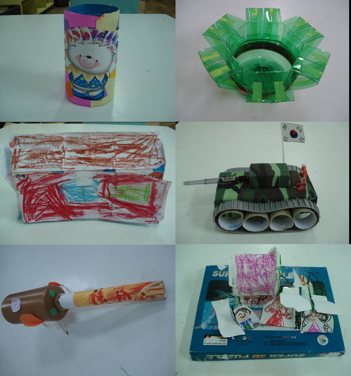 피티병을 이용한 너무 예쁜 화분, 우유팩을 이용한 이 세상에 하나뿐인 소중한 모형집, 여러 가지 매체를 이용한 코끼리 모형, 그리고 금방이라도 움직이며 대포를 쏠 듯한 탱크.