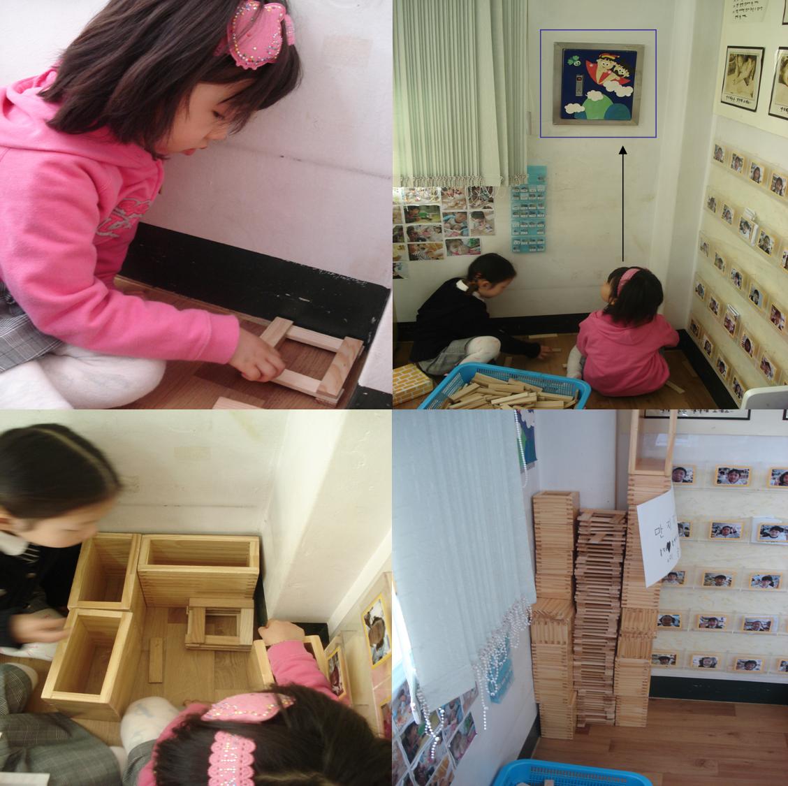 말을 건넨 유아가 자리를 떠나고 활동을 하고있던 유아는 나무 블록으로 틀을 만들고 한 쪽 벽과 나무 블럭에 탑을 붙여 쌓기를 시작했습니다.