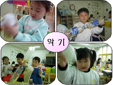 통 안에 작은 곡식을 넣고 흔들어 본 유아는 소리가 나는 것을 듣습니다. 옆에서 보고 있던 유아들이 비슷한 방법으로 여러 종류의 악기를 만들기 시작합니다.