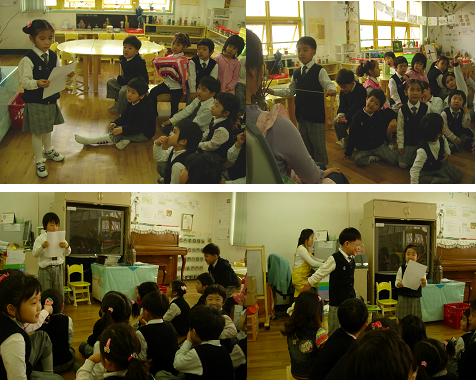 - 지난 시간 나누었던 조별이야기를 전체유아들과 함께 공유하기 위해 각 조의 유아가 한 명씩 나와 조에서 나누었던 이야기를 들려주고 궁금한 점에 대해서 토론을 하였다.