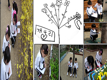 어느새 봄이 찾아와 유아들과 함께 유치원 마당 에서 그림그리기를 해 봅니다. 교사: 너의 개나리에는 다른 친구들과 조금 다른 것이 있네?