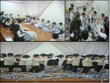 -우리 주위에서 쉽게 접할 수 있는 종이! 신문을 가지고 유아들과 강당을 찾아가 놀이를 합니다. 신문을 만져보고, 냄새도 맡고, 북소리에 맞춰 찢어도 봅니다. 잘게 찢은 신문지 위에서 수영도 하고 분수처럼 하늘 높이 던져도 봅니다. 칙칙폭폭! 한줄기차를 만들어 신문지 위에 기차가 다닐 수 있는 길을 만들어 줍니다. 놀이를 하나하나 해가면서 유아들은 손으로 눈으로 귀로서 신문과 친근해지고 특징을 몸소 느끼게 됩니다.