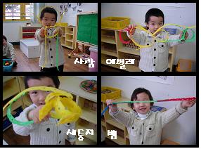 쌓기 영역의 플라스틱 끈을 연결해 여러가지 모양을 만들어 보고 있는 유아들.