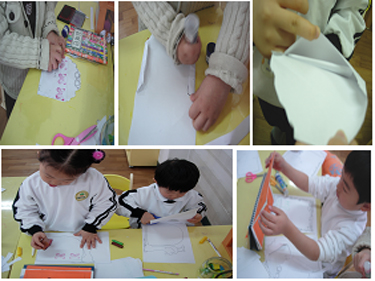 편지영역 소개를 해주기 전 유아들은 도장 찍기에 관심을 가집니다. 하얀종이에 도장을 찍어 예쁜 모양이 나온 것만으로 만족합니다.